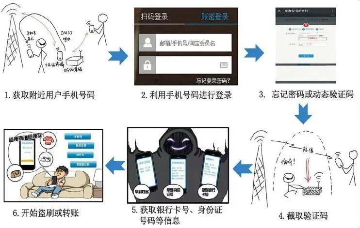 柳州警方立即成立專案組,將3名嫌疑人抓捕歸案。據(jù)交代,嫌疑人雷某和雷某斌負(fù)責(zé)利用嗅探設(shè)備竊取受害人手機(jī)信息,接收驗(yàn)證碼短信,分析機(jī)主身份證綁定的支付寶賬號(hào)和銀行卡號(hào),徐某則負(fù)責(zé)“加工”竊取來的信息,并在第三方支付平臺(tái)盜刷。從而在沒有接觸受害人手機(jī)、銀行卡且事先不知道其密碼的情況下,通過“隔空取物”的方式取走受害人銀行卡里的資金。